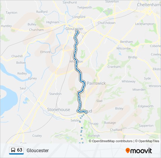 Stagecoach West 63 bus Route Schedule and Stops (Updated) The 63 bus (Gloucester) has 59 stops departing from Colliers Wood, Forest Green and ending at Transport Hub Arrival, Gloucester. Choose any of the 63 bus stops below to find updated real-time schedules and to see their route map. View on Map.