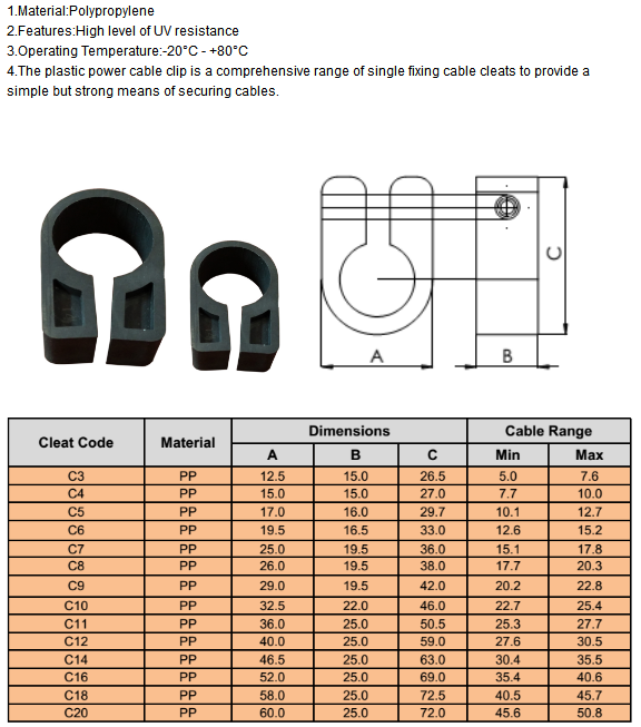 This chart details the specifications of SWA (Steel Wired Armoured) cable one-piece single fixing cable cleats.It includes key information such as cleat sizes, corresponding cable diameters they can secure and the pack quantities that they come in, although we sell them individually for your convenience.