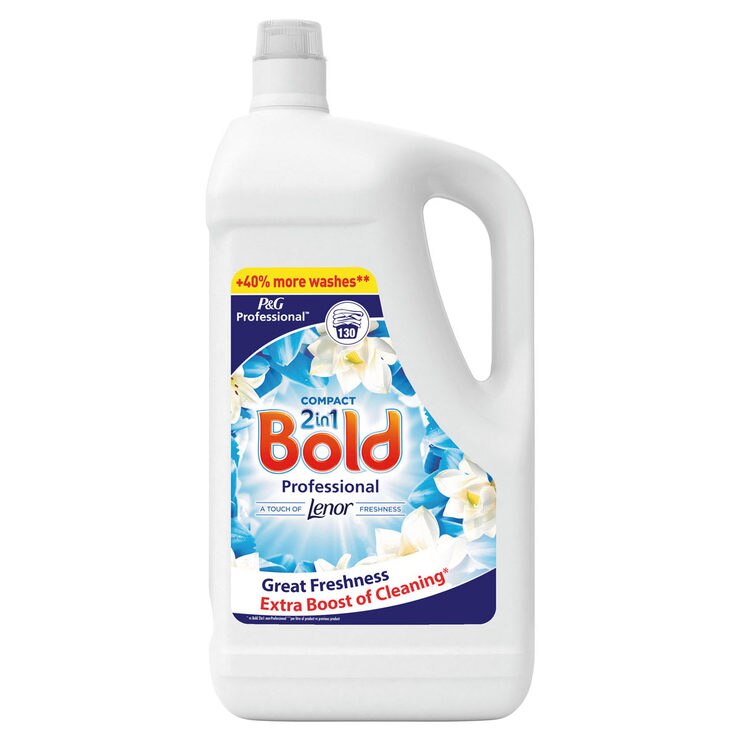 Bold 2 in1Professional Laundry Liquid Detergent 130 wash (+ 40% more washes) 4.55L. Professional detergent specially formulated to deliver outstanding cleaning and stain removal results in the first wash Designed to deliver excellent stain removal, deep down cleaning, brilliant whiteness, great freshness and efficiency at low temperatures Lasts for up to 130 washes improved, longer lasting.