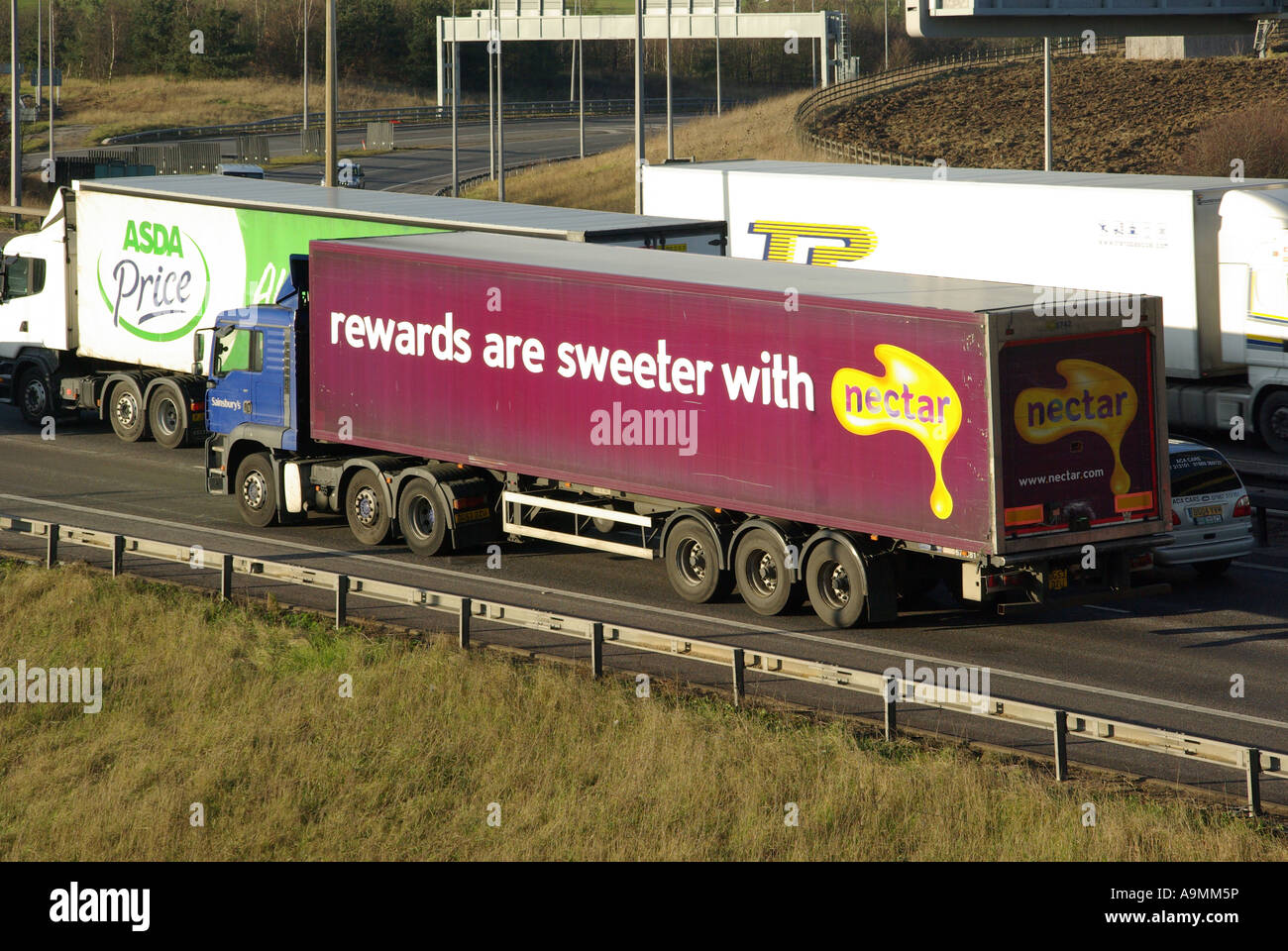 Slow moving traffic hgv lorry from Asda supermarket & Sainsbury truck with Nectar advertising on