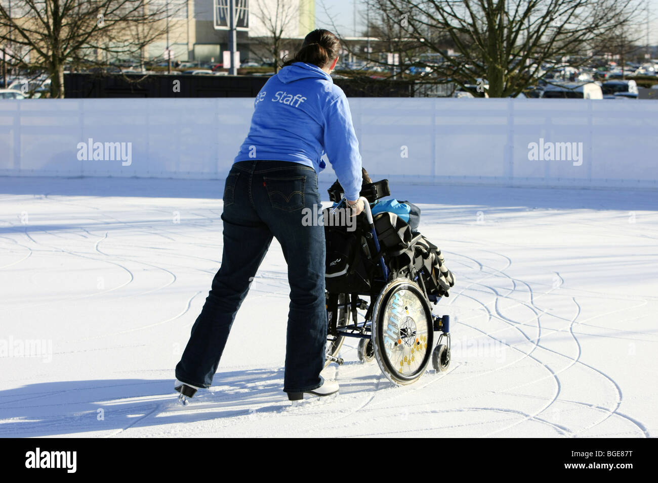 Disabled child in a wheelchair being pushed around an ice rink by a carer on a winter day out