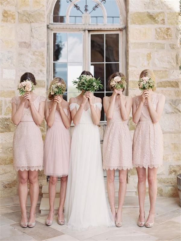 Short pink bridesmaid dresses,Elegant Lace bridesmaid dresses,Cap sleeves bridesmaid dress